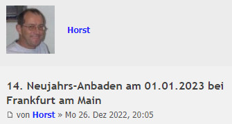 Das Jahr beginnt mit Nacktbaden – das hat ⬈ Horst mit seiner Neujahrs-Initiative „Anbaden“ schon seit vielen Jahren gezeigt. Wen aber die über die Feiertage oftmals etwas milderen Temperaturen stören, der wartet mit seinem Badeausflug lieber, bis eine sanfte Schneedecke die Landschaft verziert – so wie es in diesem Jahr 2023 Giorgaki mit seinem Badeausflug in die Lahn gemacht hat: